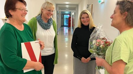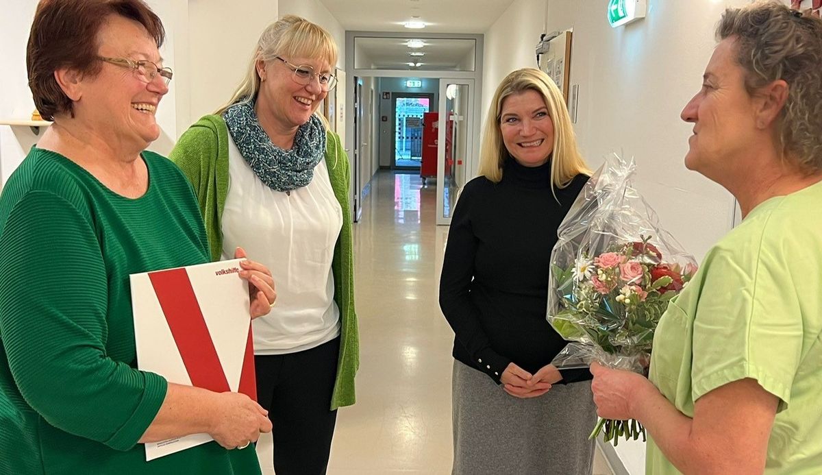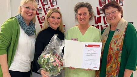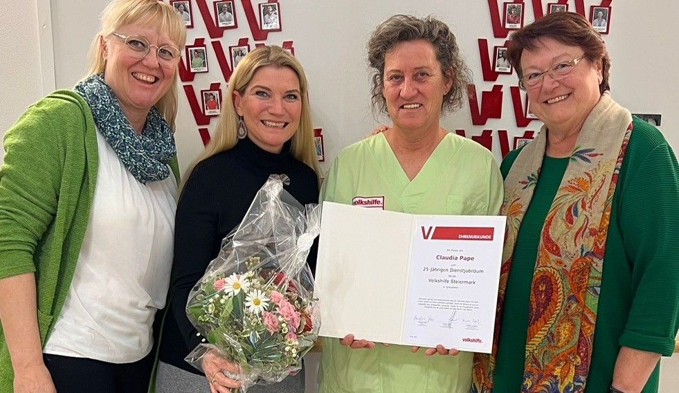 „Seit einem Vierteljahrhundert ist Claudia Pape eine unverzichtbare Stütze in unserem Team und hat sich durch ihre Zuverlässigkeit einen Namen gemacht“, erzählt Hausleiterin Franziska Pieber-Najmi. „Mit der wertvollen Arbeit, die Claudia tagtäglich leistet, ist sie aus dem Betrieb des Seniorenzentrums nicht mehr wegzudenken. Um einmal ein herzliches Danke zu sagen, organisierten Pflegedienstleiterin Sabine Strommer und ich am 22. Februar einen kleinen Festakt mit Barbara Gross als Ehrengast. Wir wünschen dir, liebe Claudia, das Allerbeste für die weitere Zukunft!“ Daran anknüpfend fand auch die Präsidentin anerkennende Worte: „25 erfolgreich absolvierte Dienstjahre – das ist ein Meilenstein, dem man nur mit einer Haltung begegnen kann: Hochachtung. Herzlichen Dank im Namen der gesamten Volkshilfe!“