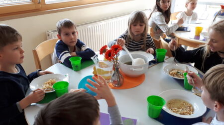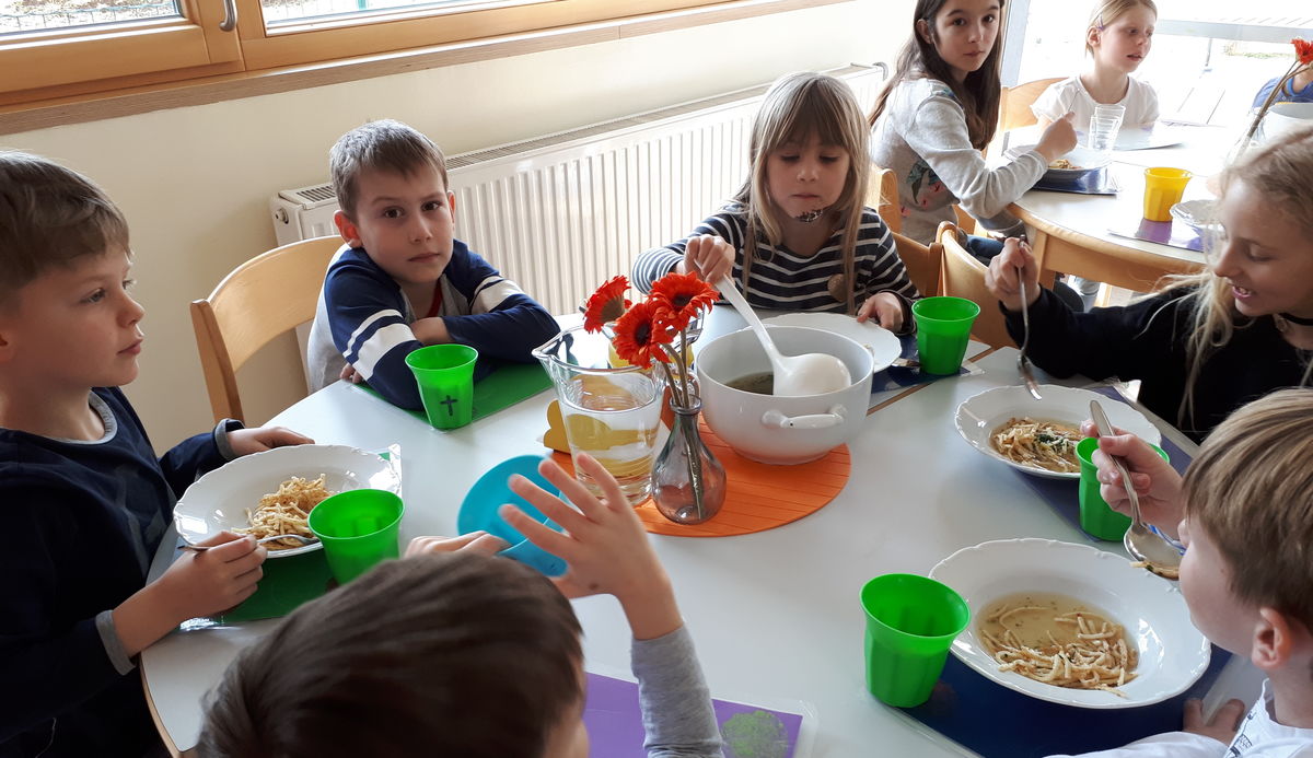 Wenn die Kinder vom Unterricht kommen, gibt es das Mittagessen, das von der Firma Gourmet geliefert wird. Die Auswahl der Speisen ist abwechslungsreich und orientiert sich an den aktuellen Geschmäckern der Kinder.