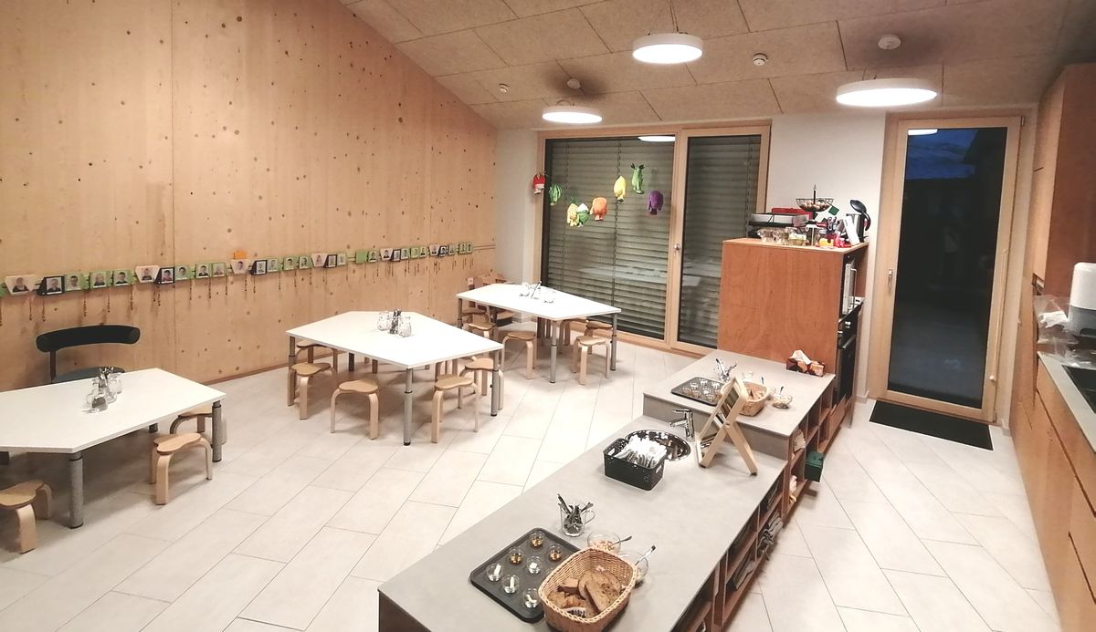 Täglich zwischen 8 und 10 Uhr bieten wir den Kindern eine gleitende/offene Jause in Form eines gesunden Buffets an, das vom Team zubereitet wird. Getränke stehen den ganzen Tag zur Verfügung. Auch das gemeinsame Mittagessen zwischen 11:30 und 13 Uhr wird in Buffetform angeboten. Wir beziehen unsere Lebensmittel von regionalen Geschäften.
