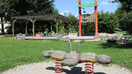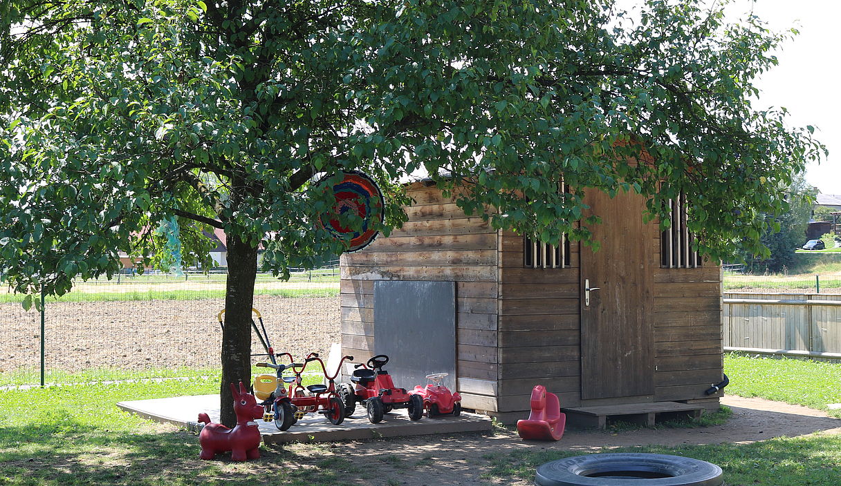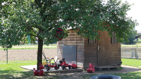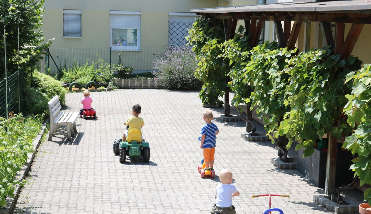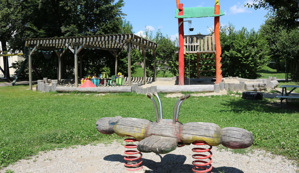 Die Kinderkrippe befindet sich in einer Wohnsiedlung, am südlichen Stadtrand von Graz. Die Einrichtung besitzt einen großen Garten und zwei kleine Gärten. Den großen Garten mit Nussbaum, Zwetschkenbaum und Apfelbaum teilt sich die Kinderkrippe mit dem Kindergarten. Eine Weinrebe sorgt in einem der zwei kleinen Gärten für Schatten und bringt uns im Herbst süße Weintrauben. Zusätzlich sät und pflanzt die Kinderkrippe jährlich frisches Obst, Gemüse und frische Kräuter, die für Jause und Mittagessen mitverwendet werden.
