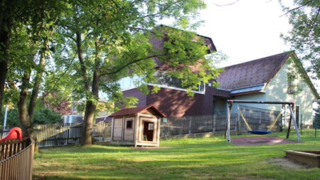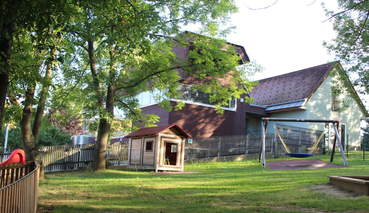 Wir haben einen großen Garten, gleich angrenzend befindet sich der öffentliche Kinderspielplatz.