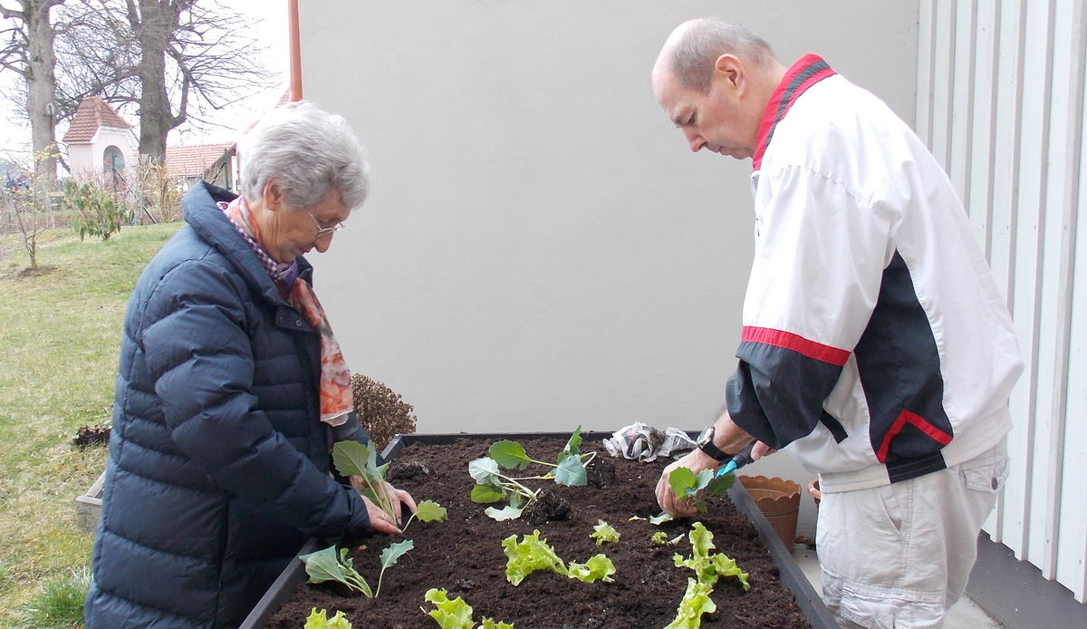 um das Seniorenzentrum ist eine Gartenanlage mit Sitzbänken angelegt, die zum Spazieren und Entspannen einlädt.
