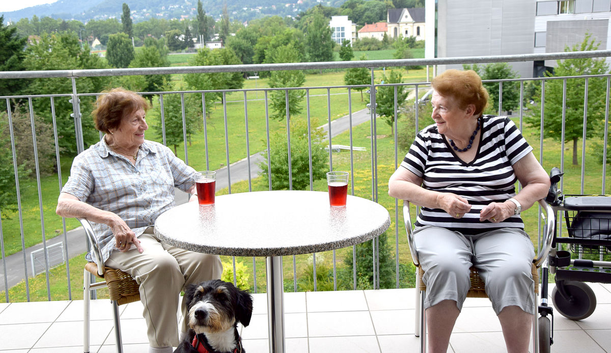 Neben unseren drei Stockwerksterrassen, mit schöner Aussicht auf die südwestlichen Berge von Graz, lädt unsere BewohnerInnen und BesucherInnen auch ein grüner Außenbereich mit Sitzgelegenheiten zum Genießen, Plaudern und Verweilen ein.